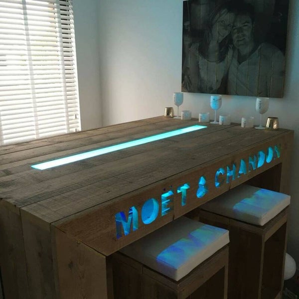 Bar met koelkast, letters en ledverlichting.