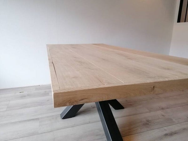 Het tafelblad is gemaakt van vier losse eiken planken van ieder 25cm breed. Om de tafel een robuust uiterlijk te geven, zijn de planken tegen elkaar geschroefd en dus niet verlijmd. Hierdoor zie je goed de losse planken en daarmee krijgt de tafel een stoer uiterlijk. Om de tafel zit een lijst om de tafel netjes af te werken. Zie foto's.