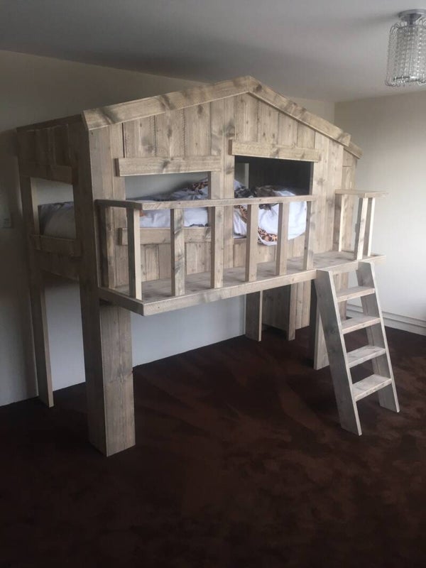 Boomhutbed en Bureau met krijtbord van steigerhout. Wat wil een kind nog meer!